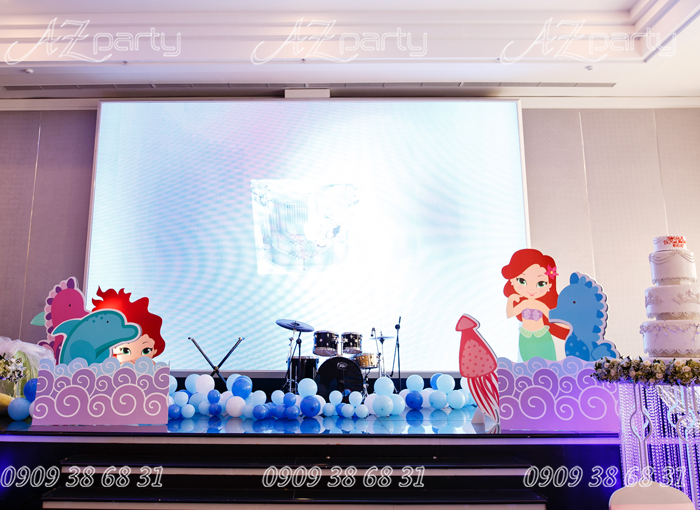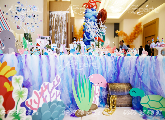Điểm nhấn đầu tiên của bữa tiệc đó chính là tất cả hình ảnh đều được thiết kế và thực hiện theo hình thức 3D nhằm đem đến cảm giác “thực”, có nghĩa là khách mời tham gia tiệc sẽ thấy mình như lạc giữa thế giới đại dương rộng lớn. Bữa tiệc với chủ đề nàng tiên cá được chọn tông màu chính là xanh nước biển, đồng thời có kết hợp thêm một số màu sắc khác như vàng, đỏ, tím, … để giúp tổng thể thêm hài hòa và lung linh hơn.