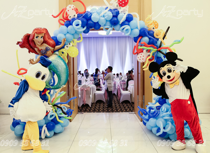 Ngoài ra, tiệc thôi nôi của bé Minh Như còn đẹp hơn bao giờ hết với hình ảnh cổng chào bong bóng được đan kết từ những bàn tay khéo léo. Cổng chào vẫn tuân thủ theo chủ đề chính của bữa tiệc với hình ảnh của nàng tiên cá xinh đẹp như vẫy chào khách mời. Ngoài ra, cổng chào còn được trang trí với rất nhiều sinh vật biển bằng bong bóng như cua, tôm, …